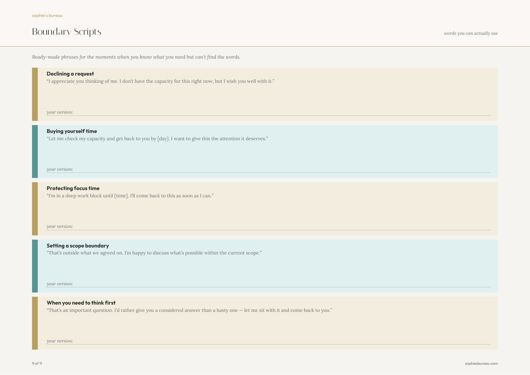 Boundary Scripts Ready-made phrases for declining requests, buying time, resetting expectations, and — critically — what to say when you've already said yes and need to walk it back.