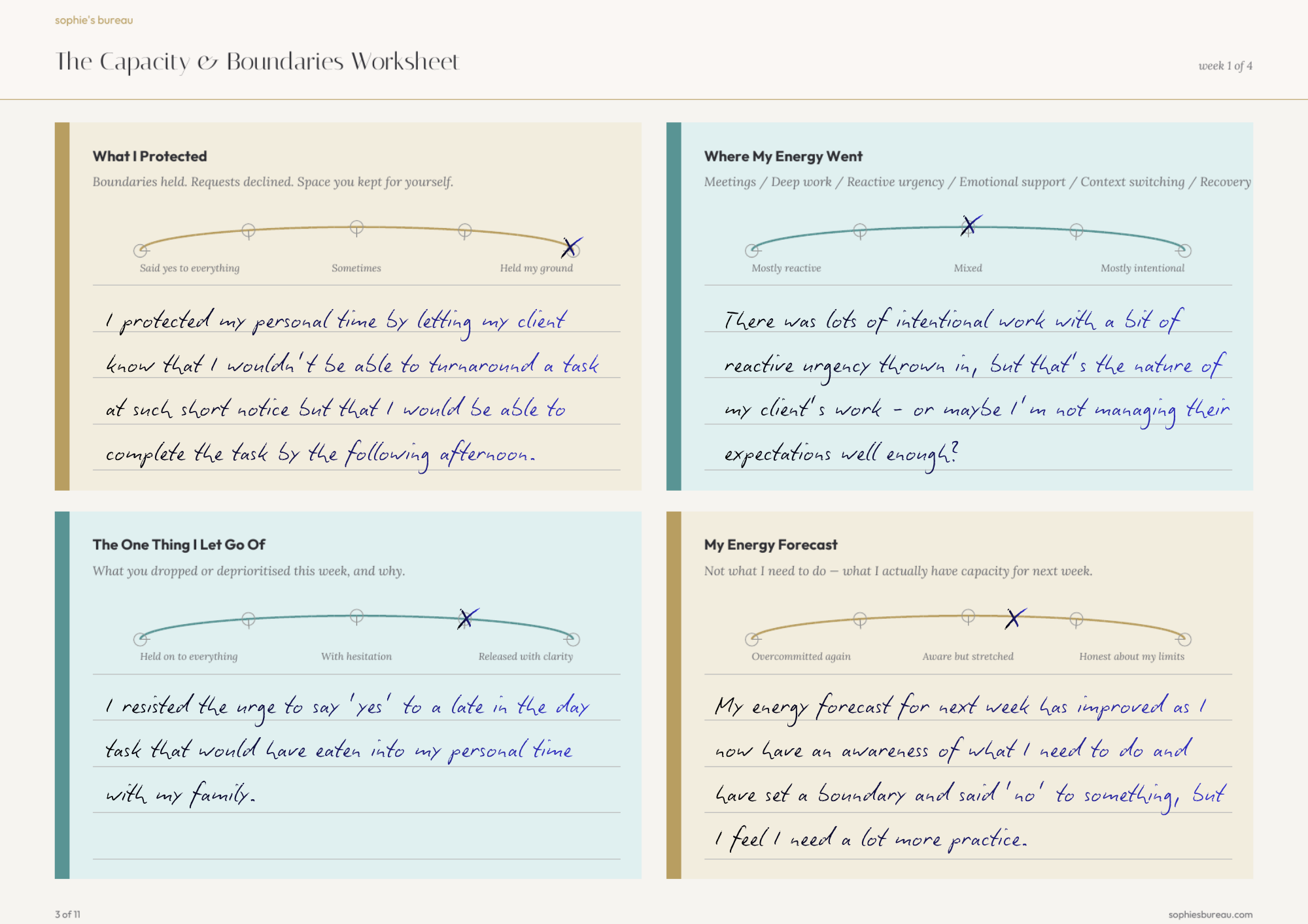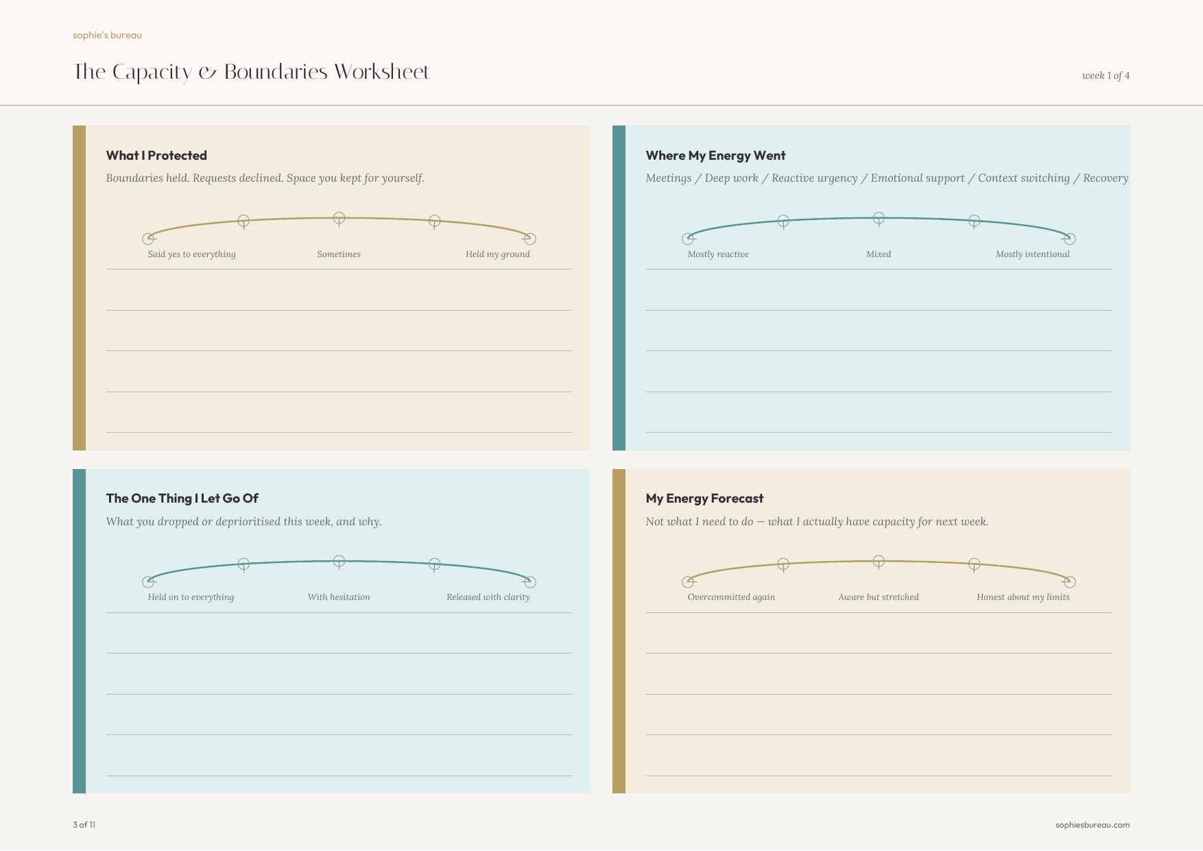 4 Weekly Worksheets Track what you protected, where your energy actually went, what you let go of, and what you can realistically handle next week. Takes 10 minutes.
